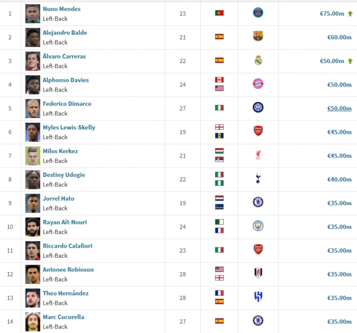 Không đăng lại mà không được phép:BeibiNews » Shiyi đã quay lại? Danh sách hậu vệ trái đáng giá: Mendes đứng đầu danh sách với 75 triệu, theo sau là Balde với 60 triệu